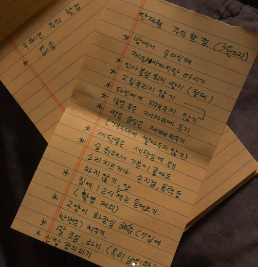 몇 시간 뒤에는 메모 사진 2장을 올렸다. 메모에는 '안재현 주의할 점'(3월까지)이라고 쓰여져 있다. 이와 함께 △밖에서 술 마실 때 저녁 10시까지만 마시기 △인사불성 되지 말기(절제) △고집부리지 않기 △타인에게 피해 주지 않기 △벗은 옷은 제자리에 두기 △먹은 음식은 제때 치우기(개수대에 쌓아두지 않기) △세탁물은 세탁실에 두기 △술 취해서 기분이 좋아도 소리 지르거나 손찌검, 폭력 등 하지 않기 △집에 12시 안에는 들어오기(촬영 제외) △고양이 화장실(7일에 한 번은) 치우기 △말조심하기(특히 남의 말) △신발 정리하기 등의 내용이 쓰여져 있다.