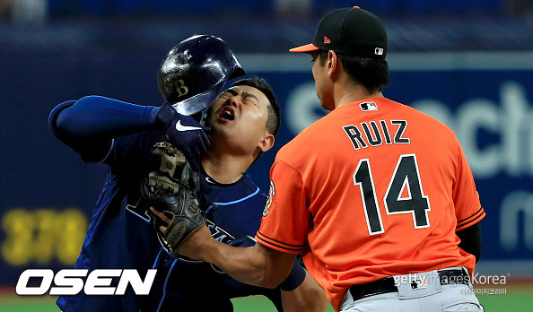 최지만(탬파베이)이 3루타를 친 후 송구에 얼굴을 맞아 교체됐다.