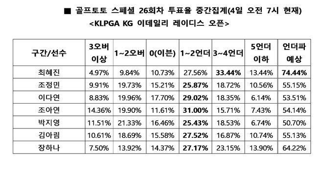 1번 최혜진 언더파 가능성 가장 높게 꼽아…5일(목) 오후 9시 50분 마감