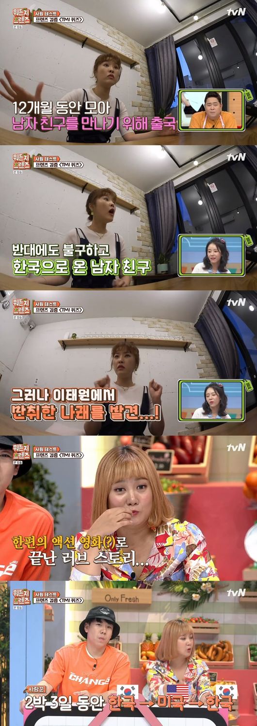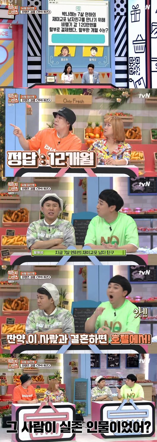황제성은 "7살 연하의 재미교포 남자친구의 진위 여부 부터 밝혀야 한다"고 말해 웃음을 자아냈다. 이 퀴즈는 양세찬이 맞췄다. 박나래는 연하의 남자친구를 만나러 가기 위해 12개월 할부로 결제해 비행기 표를 구매한 것.