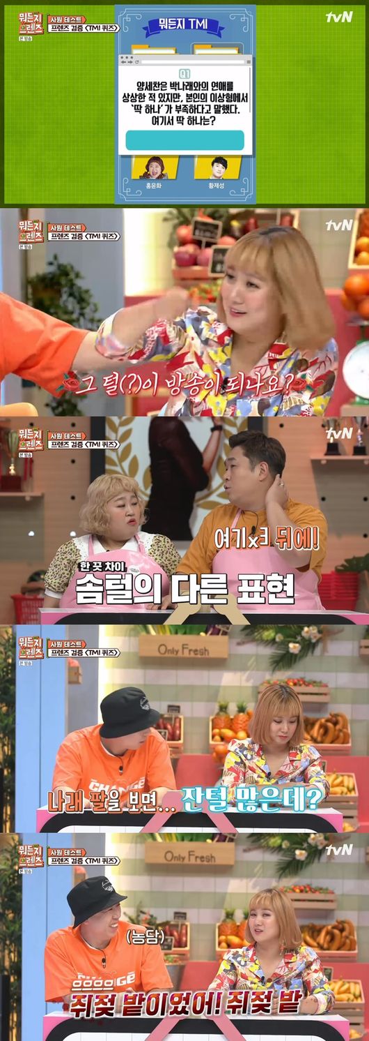 이날 양세찬에 대한 퀴즈도 공개됐다. 양세찬이 박나래와의 연애를 상상한 적 있지만 본인의 이상형에서 딱 하나가 부족해 사귀지 않았다는 것. 그 딱 하나가 무엇인지 맞추는 문제였다.