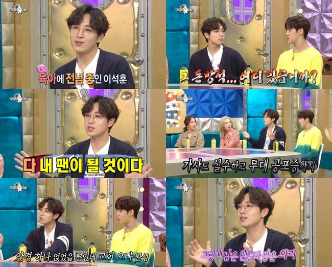 이날 이석훈은 첫 토크부터 육아의 고충을 전하며 이상적인 남편, 아빠의 면모를 드러냈다. 또 지난 7월 종영된 Mnet ‘프로듀스X101’에서 트레이너로 출연한 이석훈은 당시 연습생이었던 송유빈과의 비하인드로 사제 케미를 발산했다.