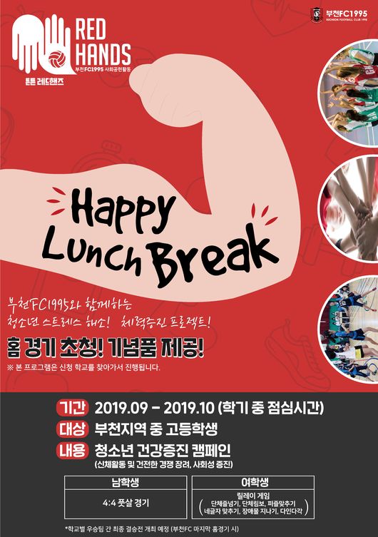 ‘해피런치 브레이크’는 부천FC1995의 사회공헌활동 ‘Red Hands’의 일환으로 부천교육지원청 협조 아래 부천 지역 내 중·고등학교 학생들의 스트레스 해소, 사회성 및 체력증진에 기여하기 위한 캠페인이다.
