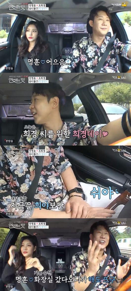 이날 천명훈은 조희경에게 목적지도 이야기하지 않고 "희경데이"라며 믿고 맡겨 달라고 말했다. 하지만 얼마 지나지 않아 천명훈이 화장실을 찾아 두 사람 모두 당황했다. 희경은 주유소 화장실을 찾았고 이내 화장실을 찾은 천명훈은 볼일을 보고 빠르게 차안으로 다시 돌아왔다.