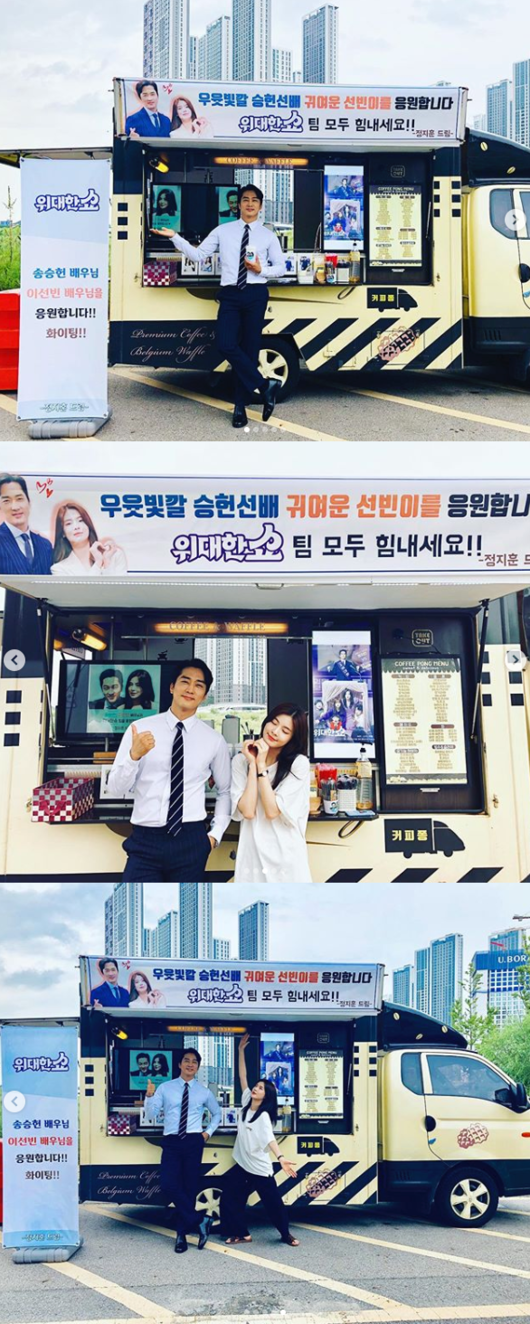 사진에서 송승헌은 정지훈이 tvN ‘위대한 쇼’ 촬영장에 보낸 커피차 선물을 자랑하고 있다. 촬영 파트너인 이선빈 역시 송승헌과 함께 정지훈의 선물에 기쁨의 포즈를 취하고 있다.