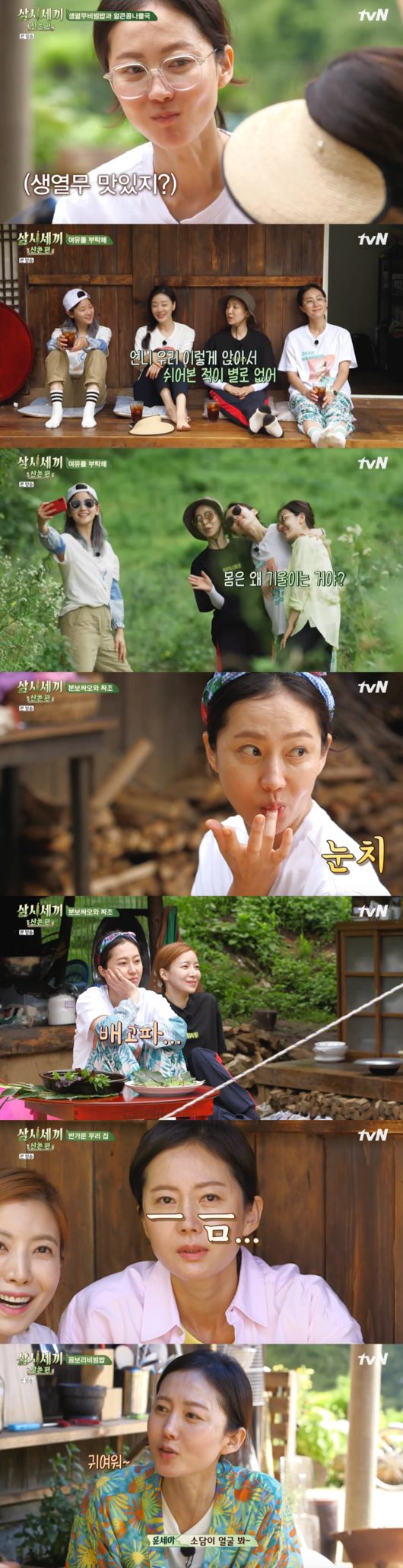 6일 방송된 tvN ‘삼시세끼 산촌편’ 5회에서 염정아, 윤세아, 박소담과 게스트 오나라는 마지막 날 아침 식사를 함께 준비했다. 메뉴는 생열무비빔밥, 얼큰 콩나물국, 달걀소시지부침. 손이 큰 염정아는 서울로 돌아가기 전 냉장고를 비우겠다며 남은 육수와 대파, 소시지 등을 꺼내 모조리 요리에 썼다.