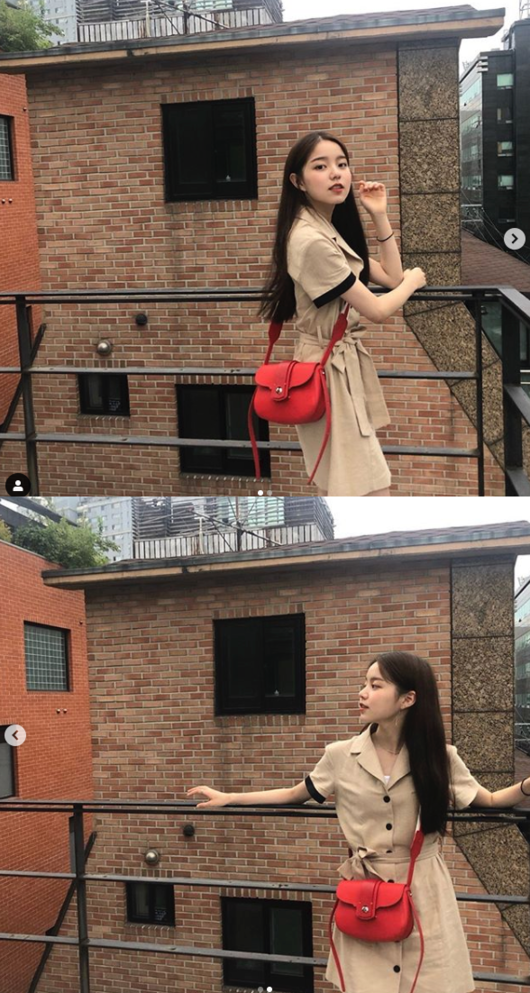 사랑스러운 비주얼과 소녀스러운 스타일링이 인상적이다. 로시는 긴생머리를 늘어뜨리고선 벨티드 원피스로 러블리 매력을 배가했다. 새빨간 크로스백은 포인트.