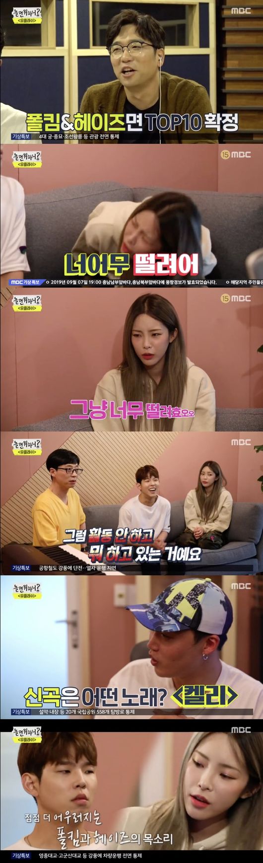 작업에 앞서 픽보이의 성대모사, 폴킴의 '안녕' 라이브, 헤이즈의 '비도 오고 그래서' 라이브 등을 들었다. 이때 헤이즈는 노래를 부르다가 갑자기 "너무 떨려"라면서 엎드렸다. 이어진 유재석의 질문에도 "그냥 너무 떨려요"라고 속삭였다.
