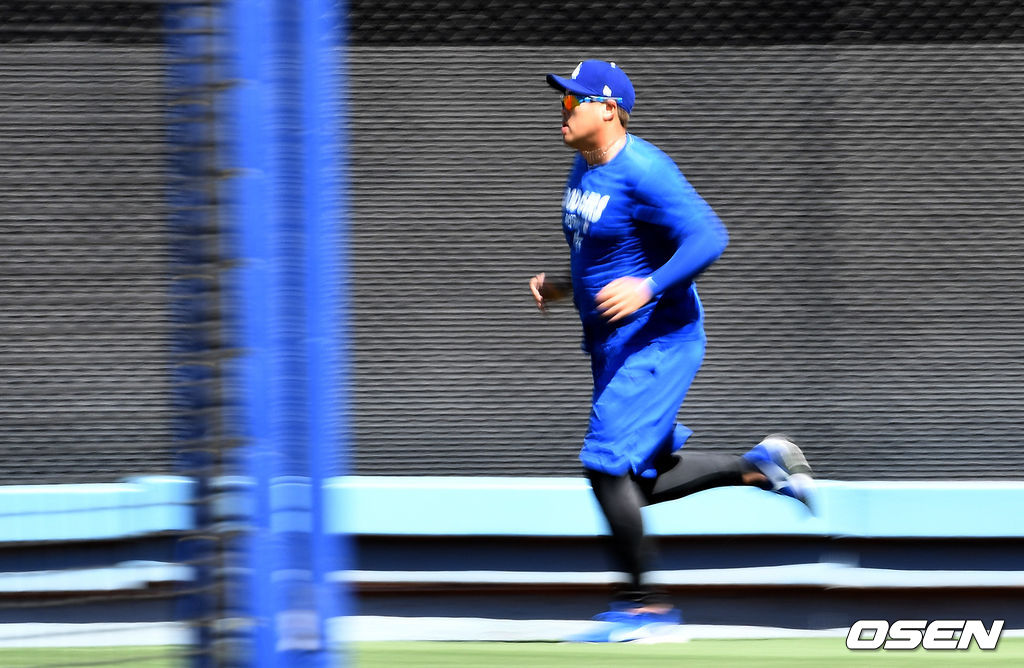 경기 전 훈련에서 다저스 류현진이 외야에서 캐치볼 훈련을 하고 있다.