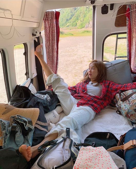 공개된 사진 속에는 옥주현이 '캠핑클럽'에서 함께 했던 캠핑카 안에 누워 장난기 넘치는 포즈를 취하고 있는 모습이 담겨있다.