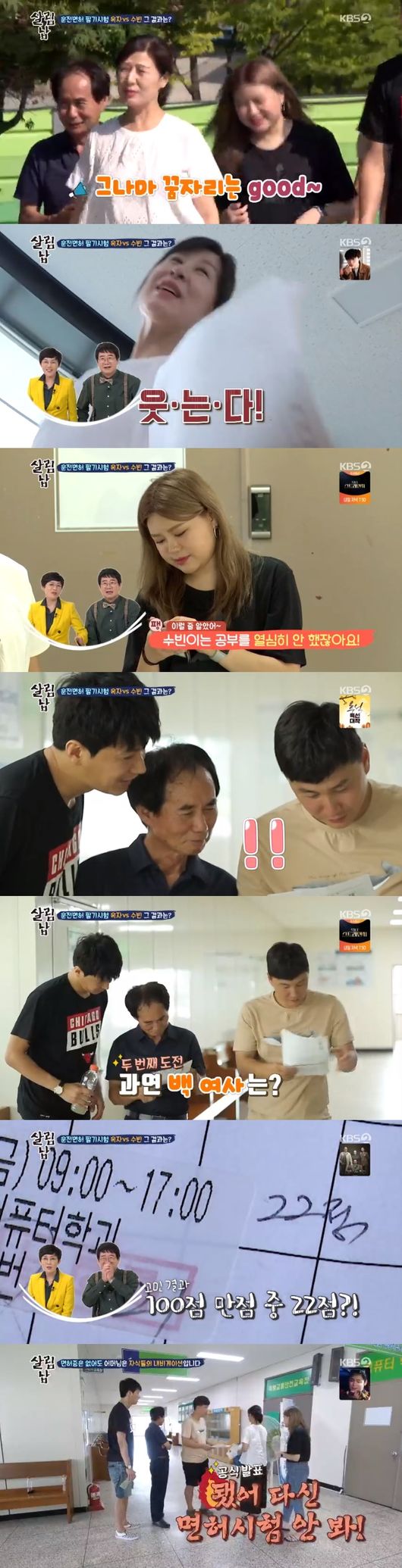 두 사람의 모습에 가족들은 "둘 다 붙은 거 아니냐"며 긴장했다. 하지만 두 사람 모두 불합격. 수빈이는 "한, 두개만 더 맞으면 되는데..."라며 아쉬워했고. 어머니는 22점을 받아 "다시는 면허 시험 안 볼 거야"라며 화를 냈다. 이어 어머니의 점수를 본 가족들은 믿기지 않는 점수를 보며 "이 점수가 지금 뭐냐"며 당황해했다.