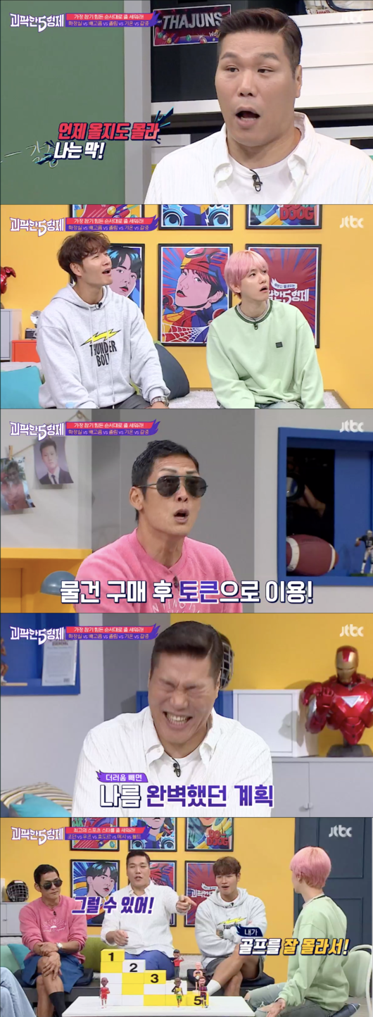 12일 오후 방송된 JTBC ‘괴팍한5형제’에선 박준형, 서장훈, 김종국, 주우재, 엑소 백현이 한자리에 모였다.