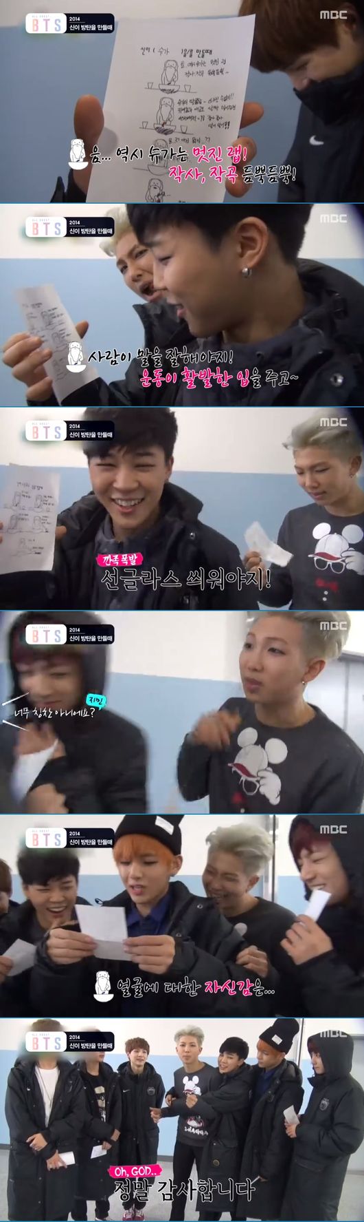 신이 방탄을 만들 때란 코너에서는 제이홉은 "슈가를 신이 만들 때 작사, 작곡 능력 멋짐 듬뿍듬뿍 넣었다'고 말했고 슈가는 "뷔를 만들 때 잘생김 넣고 식탐 넣었다며 진짜 많이 먹는다"고 말했다. "제이홉을 만들 때 깔끔함을 넣고 얼굴 길게 넣고 까불 거림을 살짝만.. 넣었다"고 말해 폭소케 했다.