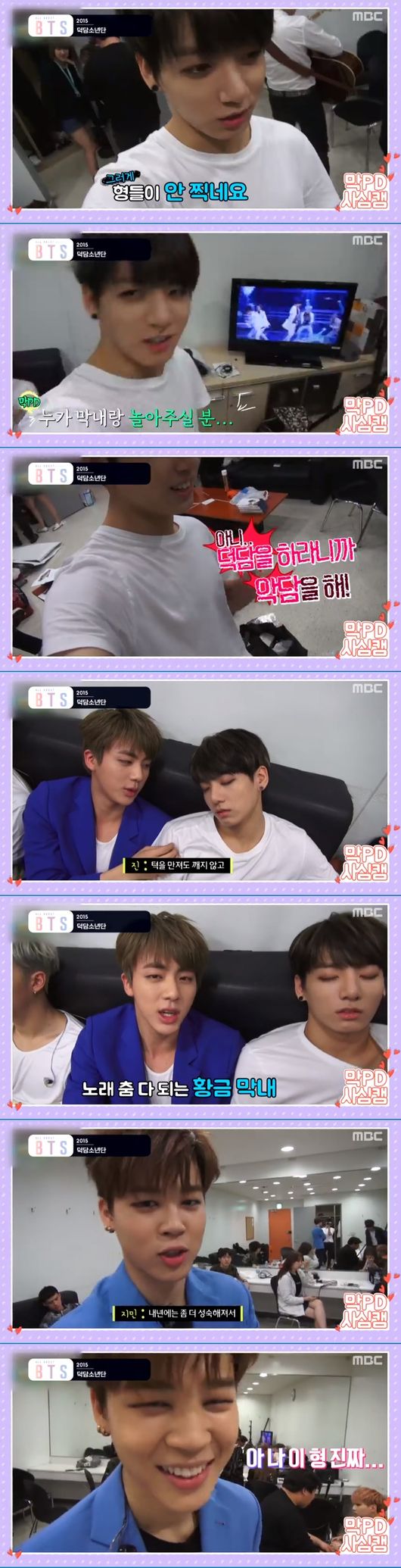 이후 대기실 모습이 그려졌다. 정국은 신나게 셀카를 찍었다. 형들이 찍지 않는다며 아쉬워했다.정국은 덕담을 해줄 멤버들 찾았다. 그러더니 정국은 “제이홉 형은 일단 말이 너무 많아서 시끄럽다”라고 돌직구를 날려 웃음을 자아냈다. 이를 들은 제이홉은 “덕담을 하라니까 왜 악담을 하고 있어”라며 버럭 화를 냈다.