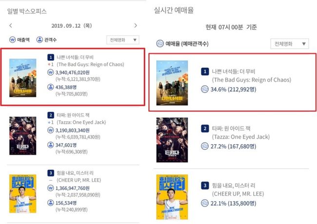 13일 오전, 영화진흥위원회 통합전산망 오전 7시 기준, '나쁜 녀석들: 더 무비'가 지난 12일 43만 6,388명(누적 71만 1,749명)의 관객을 동원하며 동시기 개봉작인 '타짜: 원 아이드 잭'(34만 7,601명), '힘을 내요, 미스터 리'(15만 6,534명) 등을 제치고 전체 박스오피스 1위를 차지해 흥행 돌풍을 이어갈 전망이다. 이와 같은 성과는 지난 2017년 추석 극장가 역주행 신화를 보여준 마동석표 액션 흥행작 '범죄도시'와 닮아 있어 '나쁜 녀석들: 더 무비'가 선보일 앞으로의 흥행 성적이 주목된다.