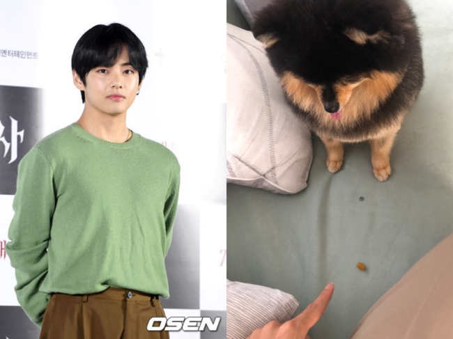공개된 사진에는 뷔의 반려견 연탄이가 기다리기 훈련을 받고 있는 모습이 담겼다. 연탄이 앞에는 간식 한 알이 놓여 있고, 이를 가리키는 뷔의 손가락도 보인다.