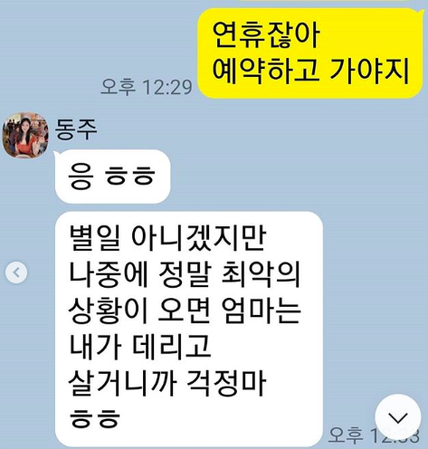 이와 함께 공개한 사진은 서정희와 서동주 모녀가 나눈 휴대폰 메시지가 담겨져 있다. 대화에서 서동주는 엄마에게 "별일 아니겠지만 나중에 정말 최악의 상황이 오면 엄마는 내가 데리고 살거니까 걱정마"라고 말해 든든함을 안긴다.