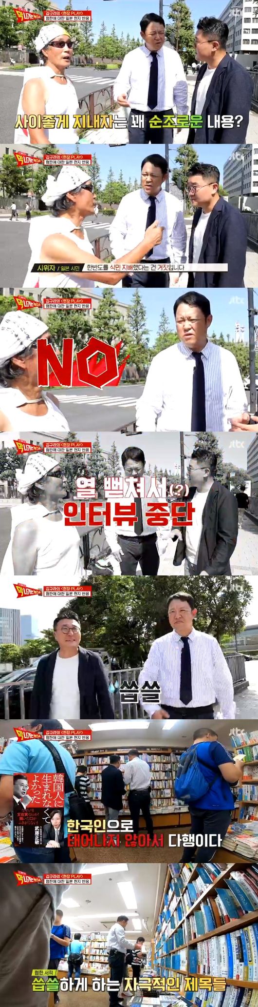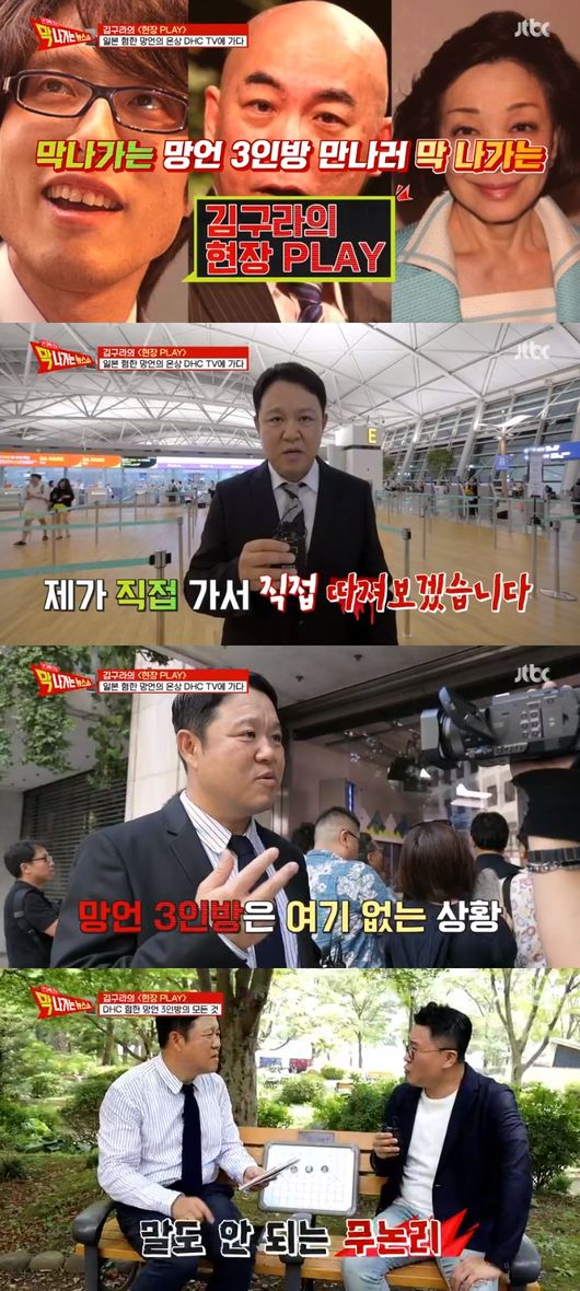 이날 정치부 기자로 나선 김구라는 ‘현장 PLAY’ 코너를 통해 일본의 혐한 망언자 취재에 나섰다. 일본으로 향하기 전 제작진은 이들에게 인터뷰 요청을 했지만, 거절당했다고 했다. 이어 김구라가 지금도 꾸준히 혐한 방송을 하고 있는 일본 DHC TV를 방문했고 그곳에서도 인터뷰 요청을 시도했지만 거절당했다.