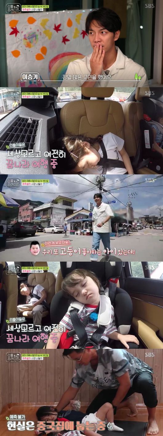 17일 방송된 SBS 예능 '리틀 포레스트'에서 먼저 돌봄이 4인방 멤버들은 리틀이들과 함께 첫 시장나들이를 나섰다. 차안에서 아이들이 단잠에 빠지자 이승기와 이서진은 "아이들 케어해야 해서 걱정, 잘 때나 피곤하면 투정부린다"면서 "억지로 깨워봤자 안 될일이라 판단해 아이들을 재우기로 하자"고 결정했다.