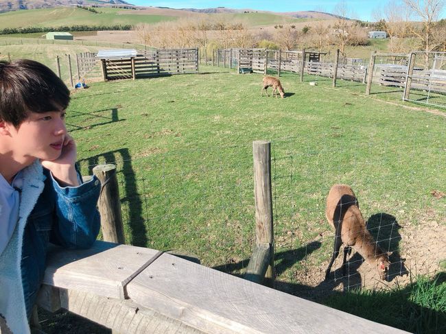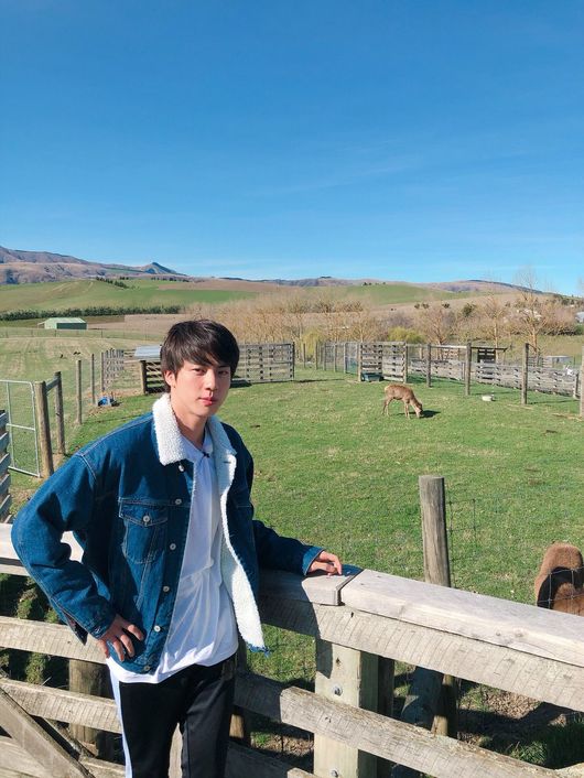 공개된 사진 속에는 푸른 초원 위 사슴을 배경으로 포즈를 취하고 있는 진의 모습이 담겨 있다. 사슴을 이용한 진의 아재개그가 웃음을 자아낸다.