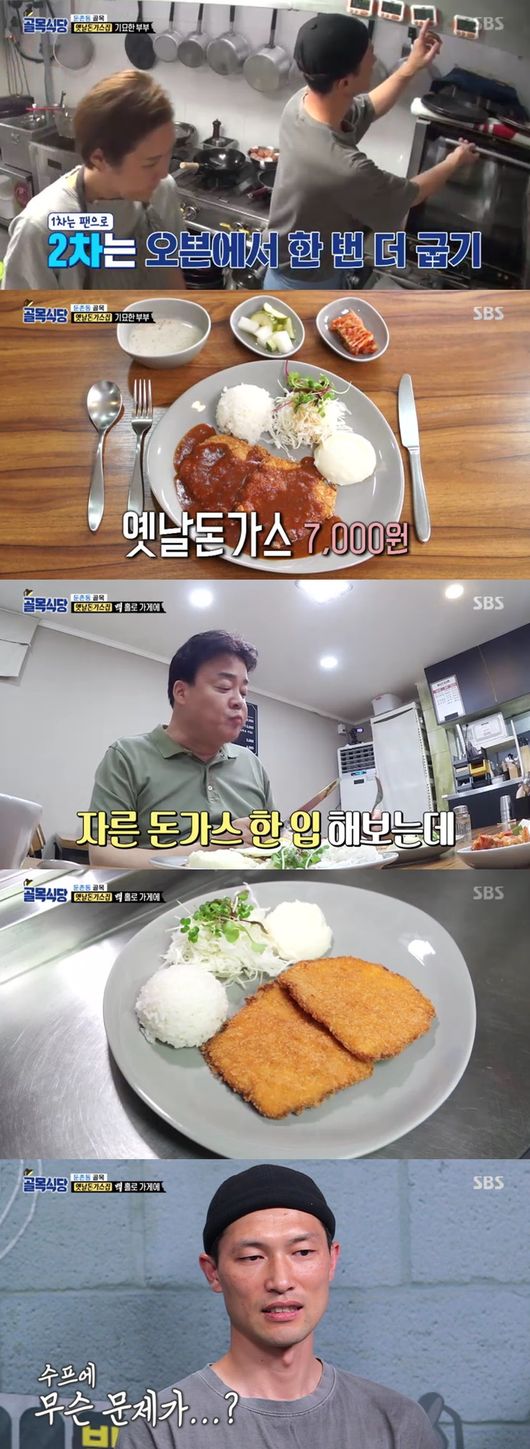 반듯하게 작고 얇다는 돈가스에 대해 사장은 "손님들 의견을 반영하다보니 그렇다"면서 "손은 손대로 가는데 손님은 없는 상황"이라 했다. 백종원은 "돈가스 전문이 아닌 집에서 돈가스 먹는 느낌"이라며 덧붙였다.