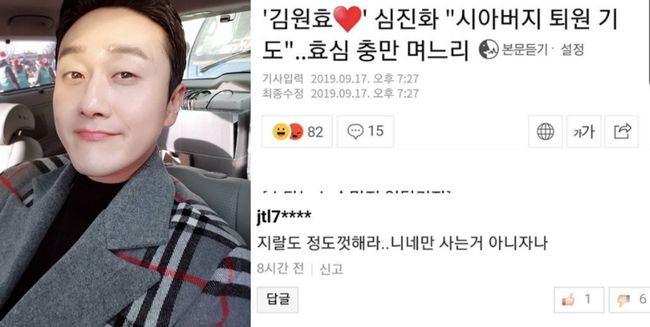 이날 김원효가 공개한 사진을 보면 한 기사에 달린 댓글을 캡처했다. 한 네티즌은 ‘지x도 정도껏 해라. 너네만 사는 거 아니잖아’라고 적었다.
