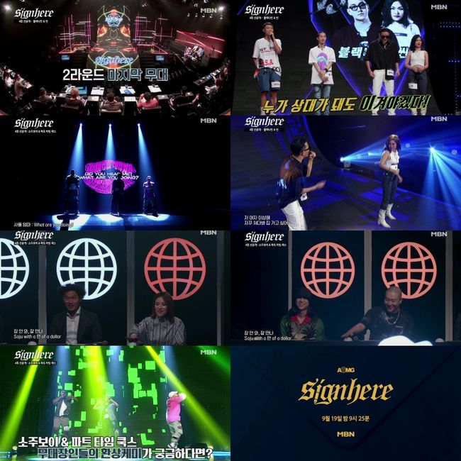 MBN X AOMG의 신개념 힙합 오디션 ‘사인히어’가 4회 방송일인 19일을 맞아 2라운드 2대2 배틀 중 파트타임 쿡스X소주보이 팀, 블랙나인X씬 팀의 ‘임팩트 甲’ 무대를 선공개했다.