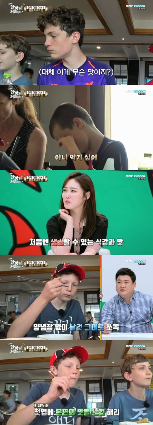 그 사이, 푸짐한 비주얼의 회 한 상차림이 준비됐다. 인생 첫 회를 맛 본 벤은 화들짝 놀라더니 입맛에 안 맞는 모습을 보였다. 급기야 막내 잭은 먹기를 포기했다. 둘째 해리는 양념장 없이 시식하더니 "맛있다"면서 만족했다.