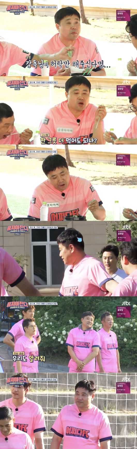 지난 19일 방송된 JTBC 예능 ‘뭉쳐야 찬다’에서는 양준혁, 이만기, 허재, 이봉주 등 전설의 운동선수들이 속한 ‘어쩌다FC’가 창립 29년 전통의 ‘만선FC’와 축구대결을 펼친 모습이 담겼다.
