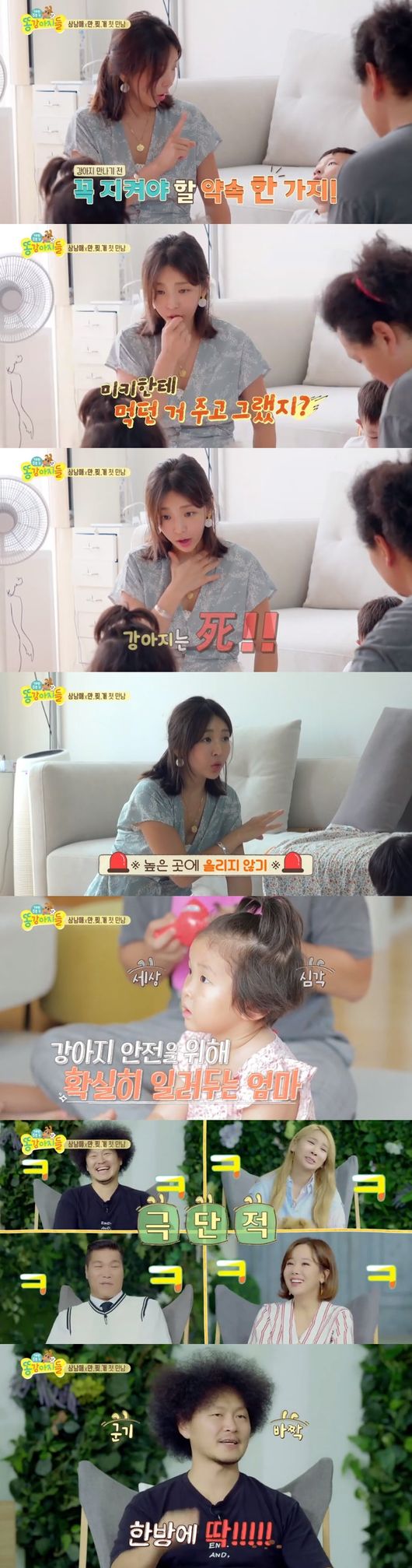 이어 자신에게도 한방에 딱 알아듣게 말한다고 해 웃음을 자아냈다. 마침내 새끼 강아지와 마주한 아이들은 양동근 아내의 말처럼 조심조심 강아지를 대했고, 새끼 강아지와 시선을 맞춰 나란히 누웠다. 이 모습을 본 설채원 수의사는 "강아지의 시선으로 마주보는 건 너무 좋은 거다. 위에서 내려다 보는 것보다 누워있는 자세가 훨씬 가까워지는데 좋다"고 대답했다.