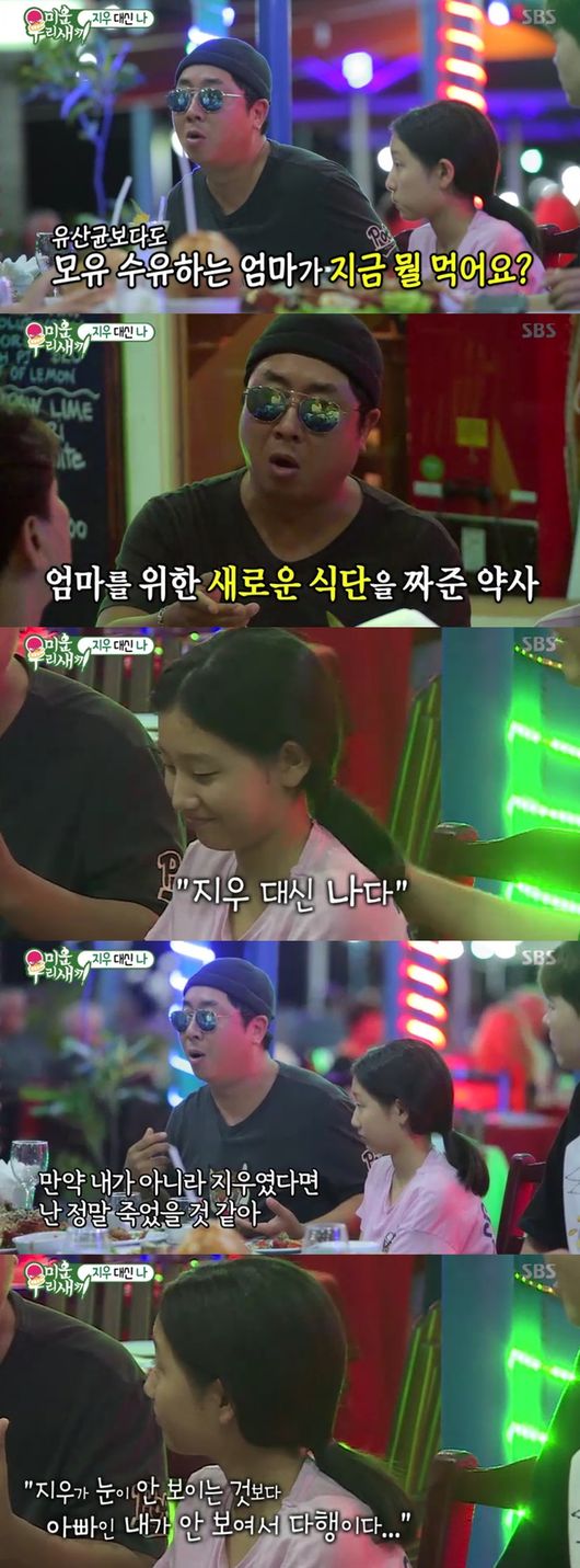 이동우는 모유수유를 언급하더니 "처음엔 미역국만 먹다가 너무 잘나와 먹고싶은 걸 다 먹어, 약사한테 말하니 엄마가 먹는 걸 그대로 아이가 먹는데 생후 몇 개월짜리한테 자극적인 음식이 그대로 간 것이라 하더라"면서 아내를 위해 약사가 새로운 식단을 짜줬다고 했다. 이동우는 "거짓말처럼 바로 그 다음날 걱정이 해결됐다, 애들 키우다보면 그런 일 많아, 특히 첫째는 경험이 없어 더 그렇다"고 회상했다.