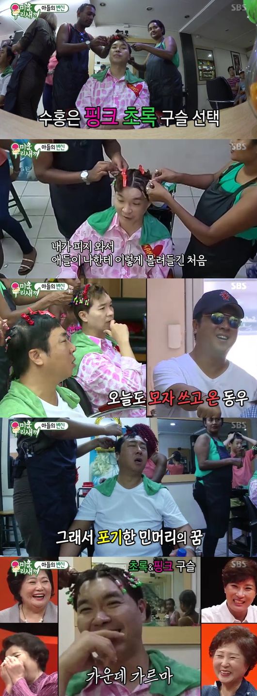 김경식은 두 사람의 변신한 머리를 보며 "너희 이제 50이다"라며 깜짝 놀랐고, 두 사람은 "나이 들어도 젊게 살아야한다"며 끝까지 완성했다. 이를 본 박수홍母는 "나 부끄럽다 정말"이라면서 "수홍이 진짜 별걸 다 한다, 쟤 이제 장가 못 가겠다"며 아들 대신 민망해했다.