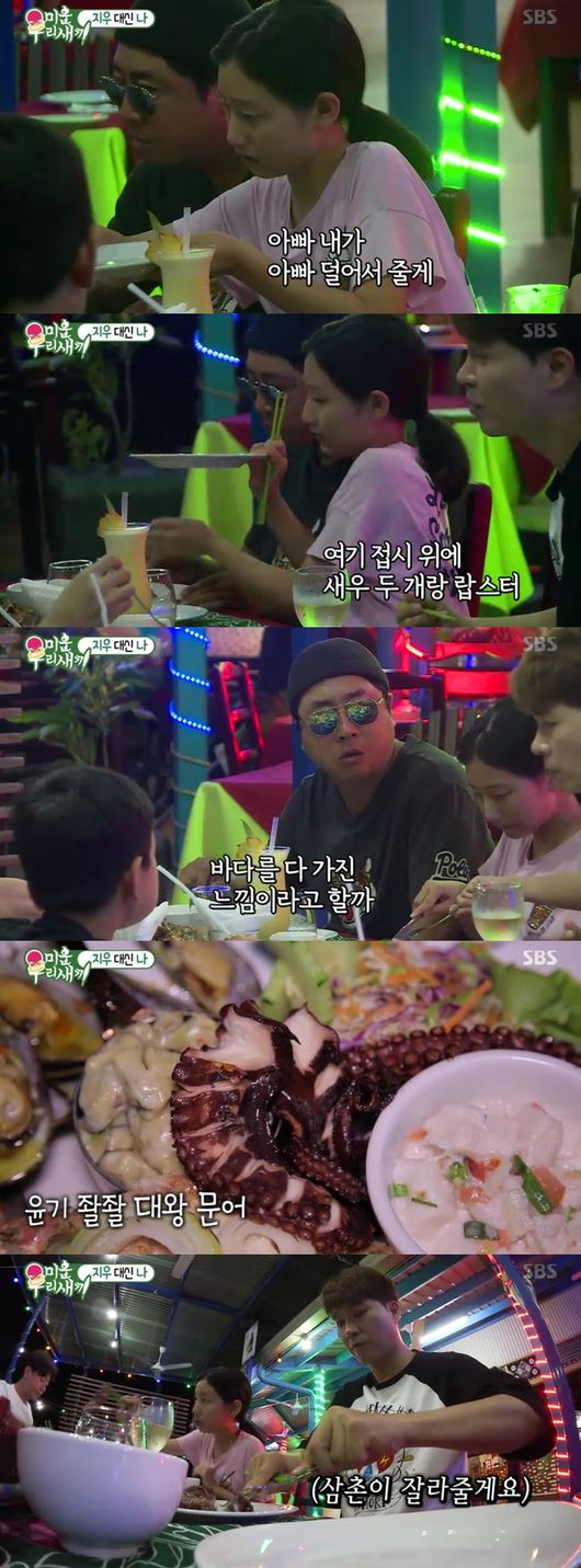 저녁이 되어 레스토랑에 도착해 해물 진수성찬으로 저녁식사 시간을 가졌다. 딸 지우는 父동우에게 레스토랑 분위기를 모두 설명해 주는 등, 父동우에게 음식을 건네주며 살뜰하게 챙겼다. 아빠 챙기는 습관이 된 지우였다. 덕분에 모두가 함께 저녁식사 먹방에 빠졌다.