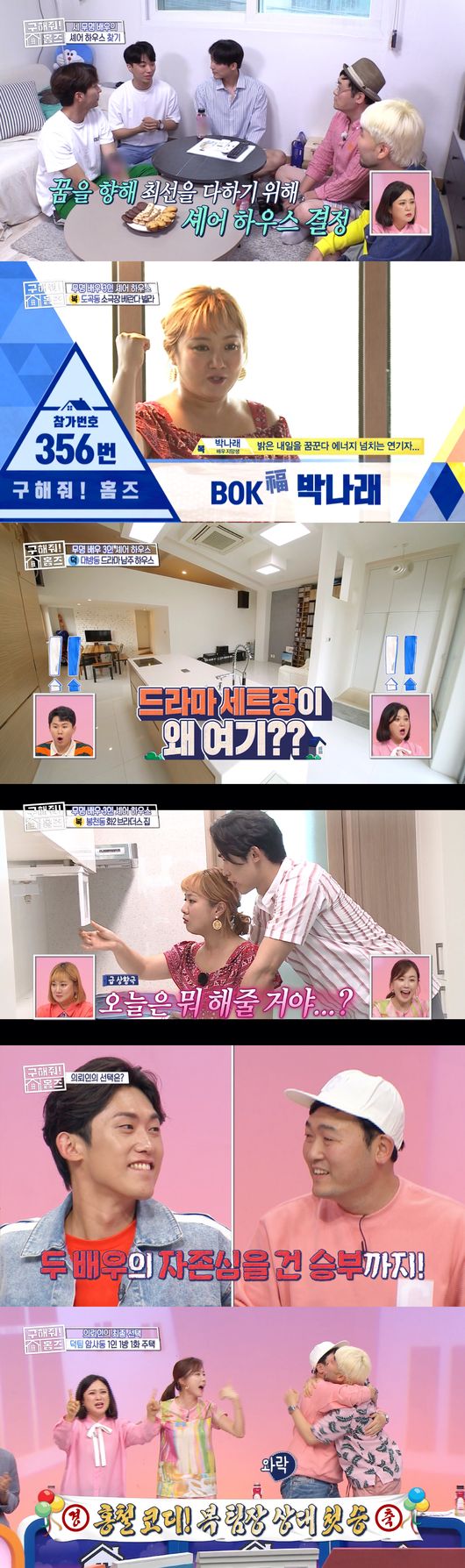 복팀에서는 박나래와 탤런트 민진웅이 매물을 찾아 나섰다. 두 사람이 무명배우 삼인방을 위해 찾은 곳은 도곡동에 위치한 ‘소극장 베란다 빌라’. 넓은 거실과 싸리고개 공원 뷰가 인상적이었지만 계단으로 탑층까지 올라가야 한다는 아쉬움이 있었다.