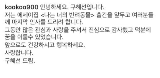 구혜선은 지난 1일 자신의 SNS에 “에세이집 ‘나는 너의 반려동물’ 출간을 앞두고 여러분들께 마지막 인사를 드리려 한다"라는 글을 적었다.