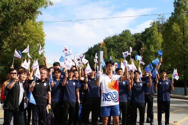 23일'제100회 전국체육대회’의 성공 개최를 기원하는 성화봉송 행사가 천안시청 일대에서 진행됐다. 제 100회 전국체육대회의 성공적인 개최를 응원하기 위해 선수단이 총출동해 축하행사에 참여했다.
