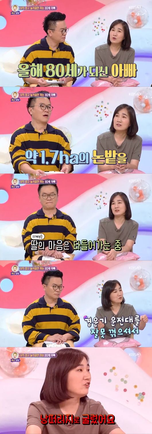 딸은 "아버지가 여든의 나이에도 농사를 포기하시질 않는다 아직도 5천 평, 6천 평 규모의 농사를 지으신다"며 "경운기를 타고 가다가 핸들을 잘 못 돌려서 사고를 크게 당하셨다. 마을 주민들도 천운이라고 할 정도였다"라고 말했다.