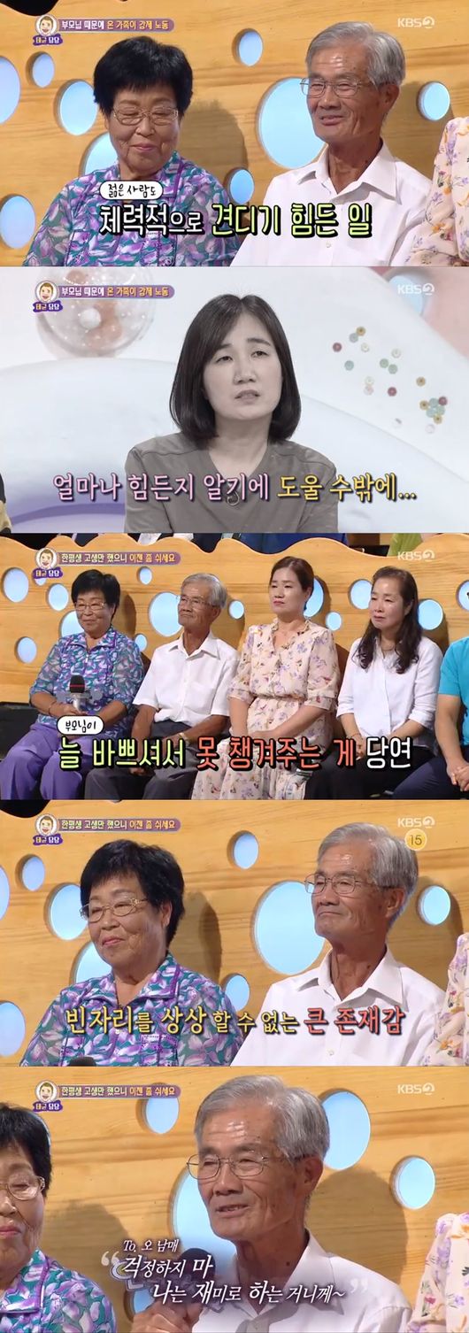 김태균은 "막내 딸이 아버지가 일을 너무 많이 하셔서 고민이라고 한다"라고 말했다. 이에 아버지는 "어렸을 때부터 하던 일이라 괜찮다"며 "12살 때 6.25가 터졌다. 그땐 못 먹고 살아서 일을 해야 했다"라고 말했다.