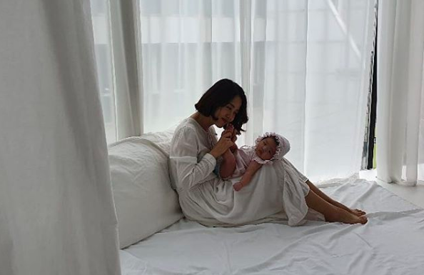 사진 속에서 이하정은 딸 유담 양과 사랑스러운 분위기 속에서 사진을 찍고 있는 모습. 이하정은 딸의 발을 만지며 행복해 하는 표정을 짓고 있다.