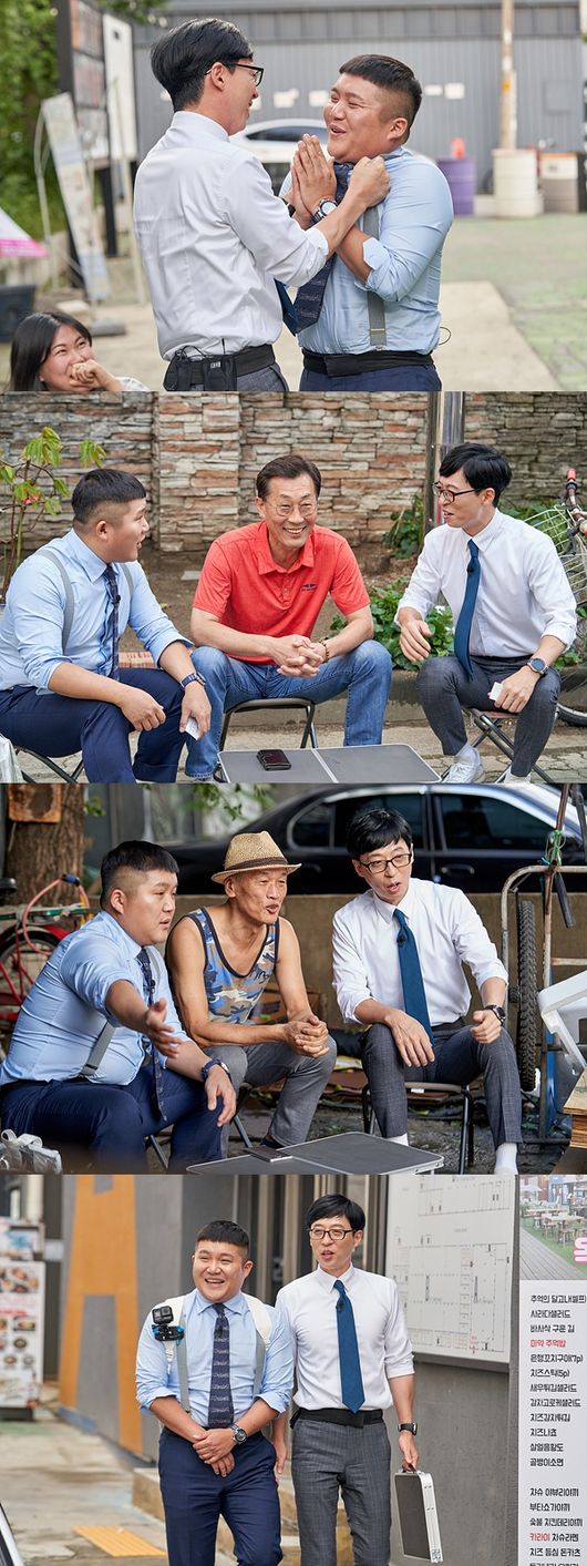 한편 아파트 단지 앞에서는 35년 직장생활을 마치고 정년퇴임 후 3개월째 아파트 회장직을 맡고 있는 ‘병아리 회장님’을 만난다. 회장을 뽑는 방식부터 회장의 역할, 함께 운영하고 있는 분들에 대한 소개를 힘차게 이어가던 회장님은 35년간 일하던 직장에서 퇴임할 때의 소감을 묻는 질문에는 차분한 느낌을 전했다. 또 축하를 전하는 두 자기에게 “퇴임 축하를 유재석, 조세호씨한테 받다니 더 새롭다. 꽃다발을 준비할 수 있게 미리 사연이라도 보낼걸 그랬다”고 위트 있는 멘트를 덧붙이기도 했다고.