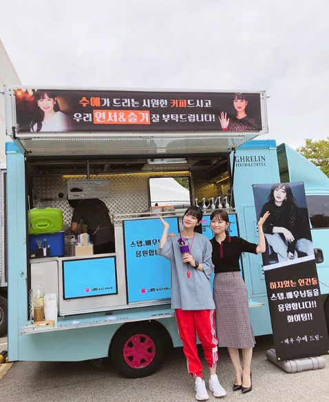 배우 오연서와 김슬기가 수애의 커피차 선물을 받고 환한 미소를 지었다.