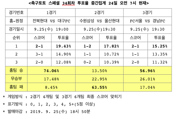 국민체육진흥공단이 발행하는 체육진흥투표권 스포츠토토의 수탁사업자인 ㈜케이토토는 25일(수)에 열리는 2019시즌 K리그1 3경기를 대상으로 한 축구토토 스페셜 34회차 투표율을 중간집계한 결과, 참가자의 74.06%가 전북-대구(1경기)전에서 리그 선두 전북의 우세를 전망했다고 밝혔다.