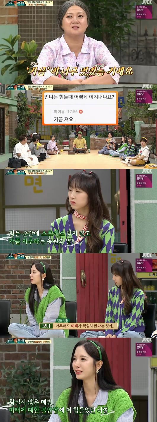 이 분위기를 몰아 '살면서 힘들었던 순간'을 물었다. 우주소녀 보나는 연습기간이 5년이라 고백, 수빈은 8년이라 했다. 두 사람은 "확실치 않은 데뷔, 기약없는 미래가 불안했다"면서 과거를 떠올렸다.