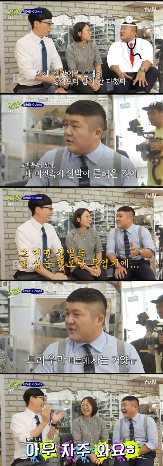 조세호는 "신발에 집착하게 된 계기가 있다"며 "어렸을 때 트럭에 발이 깔렸다. 근데 그때 의사 선생님이 신발 때문에 살았다고 하더라. 그날 이후로 신발에 많이 신경쓰게 됐다"라고 말했다.