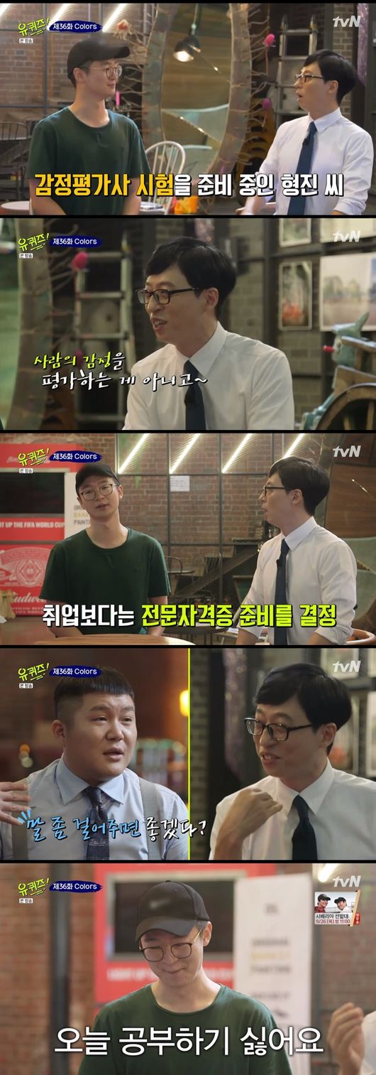 이날 유재석과 조세호는 감정평가사를 준비하고 있는 김형진씨를 만났다. 유재석은 "감정평가사를 준비하게 된 계기가 있냐"고 물었다. 이에 김형진씨는 "원래는 회사를 가려고 했는데 스펙이 좀 미흡해서 자격증 시험을 준비하게 됐다"라고 말했다.