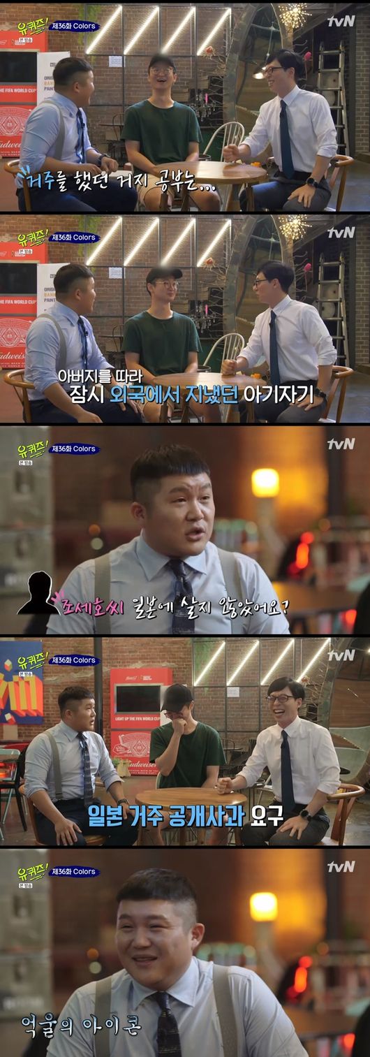 이에 조세호는 "요즘 사람들이 내게 일본에 살았다고 사죄하라고 하는데 어떻게 해야할 지 모르겠다. 난 그냥 아버지 따라 가서 거주를 했을 뿐이다"라고 말해 웃음을 자아냈다.