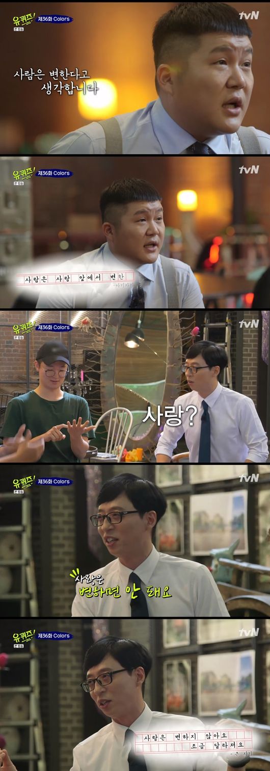 곤란해하던 유재석은 "사랑은 변하면 안된다"며 "근데 좀 달라졌다. 변하는 건 아니다. 조금 달라질 뿐이다. 하지만 변하진 않는다"라고 말해 웃음을 자아냈다.