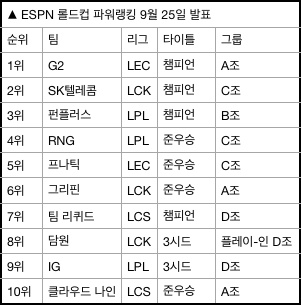 ESPN은 25일 오전(이하 한국시간) 2019 시즌 ‘LOL 월드 챔피언십(이하 롤드컵)'에 참가한 e스포츠 프로팀의 파워랭킹을 공개했다. 그랜드 슬램을 노리는 ‘LOL 유로피안 챔피언십(이하 LEC)’의 호랑이 G2가 시즌 파워 랭킹에 이어 1위를 유지한 가운데 LCK의 스프링-서머 시즌 챔피언 SK텔레콤이 2위에 등극했다.