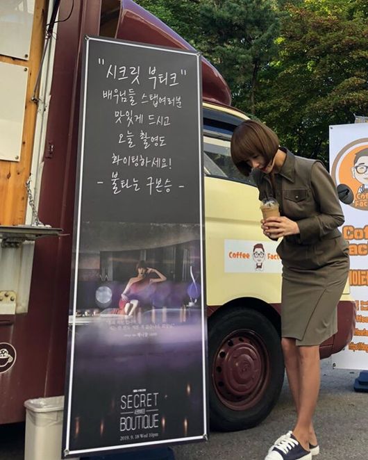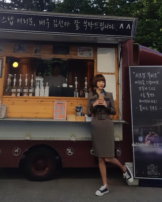 공개된 사진 속에는 구본승이 '시크릿 부티크' 촬영 현장에 보낸 커피차 앞에서 다양한 포즈를 취하고 있는 김선아의 모습이 담겨 있다. 두 사람의 변함 없는 우정이 훈훈함을 자아낸다.