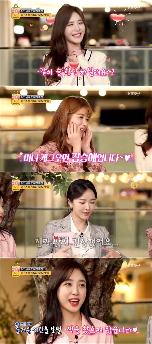 김승혜는 선미의 ‘날라리’ 커버 댄스를 선보이며 뜨거운 호응을 얻었다. ‘야구여신’ 최희는 “매니저가 강력하게 추천했다. 내가 금요일에 일 마치면 바로 퇴근해서 고양이랑 지내니까 집순이가 됐다. 그래서 연애를 했으면 한다고 해서 출연하게 됐다”고 출사표를 던졌다.